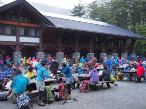 上高地は登山客で混雑していました。ここで準備を整えて出発します。