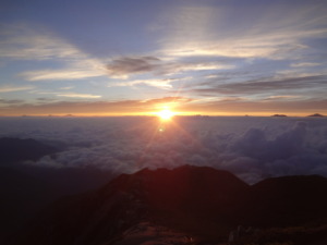 再び慌てて山頂に向かうと、雲海の上に北アルプス、乗鞍岳、御嶽山、南アルプス、富士山と全てが見える絶景になっていました。